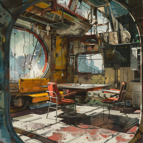 Fallout post apocalypse interior abstract losose cyberpunk patterns by in the style of Graham Sutherland mixed with Syd Mead --v 6.0