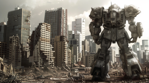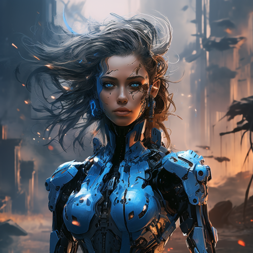 Create a detailed and compelling full-body illustration of a futuristic female robot in the midst of battle within a post-apocalyptic world. Emphasize the color blue and infuse the character with a blend of advanced technology, feminine features, and unyielding strength, reflecting her resilience in the face of a ravaged world. Robot Description: Color Palette: Utilize a range of blue shades, from deep cobalt to vibrant turquoise, to create a visually striking and cohesive color scheme. Add accents of metallic silver, weathered gray, and muted tones to denote wear and tear from the harsh environment. Use strategic touches of glowing neon lights or energy accents to highlight key features. Design Style: Craft the robot with a humanoid, feminine physique, balancing grace and power. Incorporate sleek, metallic armor with intricate details, representing advanced technology. Integrate battle scars, worn textures, and rusted components to convey the challenges of survival in a post-apocalyptic setting. Pose: Depict the robot in a dynamic and fierce combat stance, capturing a moment of intense action. Whether she's wielding futuristic weaponry, engaging in hand-to-hand combat, or evoking a commanding presence, ensure the pose showcases her strength, agility, and determination. Environment: Situate the robot in a desolate and war-torn landscape. Illustrate the ruins of once-grand structures, overgrown vegetation, and remnants of advanced technology reclaimed by nature. Use atmospheric effects like dust clouds, smoke, or subtle lighting to enhance the dramatic impact of the scene. Narrative Element: Convey a sense of purpose and emotion in the robot's expression. Is she a lone survivor fighting for her people, a guardian protecting the last sanctuary, or a relentless [...]