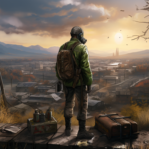 a distracted man wearing a gas mask watching a computer screen:: in a small office::1.5 Post-apocalyptic Colorgrading, detailed, 8k, photorealistic, shaders, lumen. --ar 16:9 --v 5.1