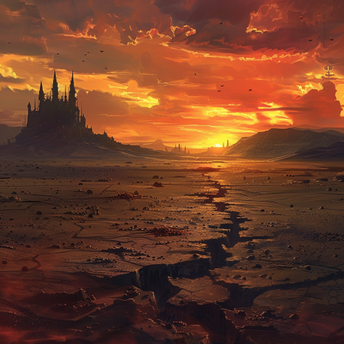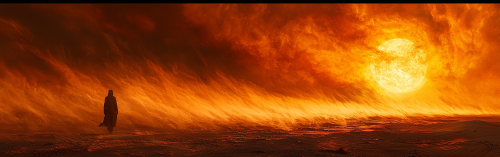 a desert landscape at sunset, with the glowing yellow and orange sun sinking below the horizon, a fierce sandstorm sweeps across the dunes, creating swirling patterns of dust in the air. In the distance, the silhouette of a lone figure is barely visible, approaching the horizon through the haze. cinematic, atmospheric, with dramatic shadows and a mystical ambiance sref 644709547 --v 6.1 --q 2 --style raw --s 750 --ar 19:6