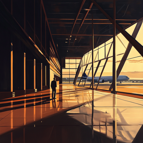 A lone traveler standing in a nearly empty airport terminal, bathed in the warm glow of sunrise as he gazes at the plane outside. The scene is imbued with a sense of quiet anticipation. Realistic style, wide-angle shot, capturing the serene mood and architectural lines of the terminal --s 50 --style raw