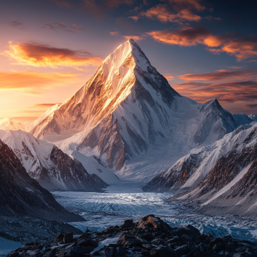 A breathtaking view of the Tre Cime di Lavaredo (Three Peaks of Lavaredo) in the Dolomites, Italy. The three towering limestone peaks rise dramatically from a rugged, rocky landscape. The central peak, the tallest, stands majestically, flanked by the slightly shorter northern and southern peaks. The scene is set at sunset, with the golden light casting a warm glow on the cliffs, highlighting their sharp edges and rough texture. Below the peaks, a high-altitude plateau is dotted with small patches of snow, alpine meadows, and a winding hiking trail. In the foreground, wildflowers and jagged boulders add detail to the natural scene. The sky is a mix of deep blue and fiery orange, with a few wispy clouds reflecting the colors of the setting sun. The sheer scale and beauty of the mountains create an awe-inspiring, almost mystical atmosphere.