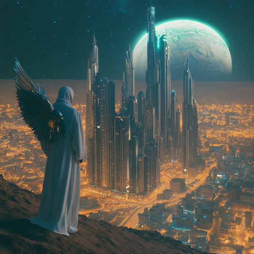 uturistic Riyadh cityscape with towering skyscrapers and a glowing planet in the background. A lone Saudi man wearing saudi costumes with wings on his back stands on a desert hill, gazing at the city. 8k resolution, hyperrealistic, cinematic, detailed.