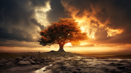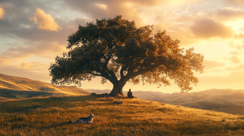 A tranquil scene in the wilderness with a lone traveler and a wolf resting under a sprawling oak tree, surrounded by rolling hills that stretch into the distance, the sky painted with warm hues of sunset, capturing the bond between man and nature, Photography, cinematic landscape with natural lighting, --ar 16:9 --v 6.1
