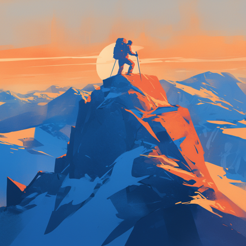 A weary traveler climbing a steep mountain path, with sweat glistening on their brow. In the background, a breathtaking sunrise is visible at the summit, representing the hard-earned reward of pursuing dreams through struggle and determination. --niji 6