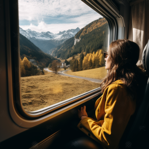 Cinematic and symmetrical beautiful shot of female traveler, travel blogger and inspired adventurer hang out of train window, look at amazing landscape of autumn mountains