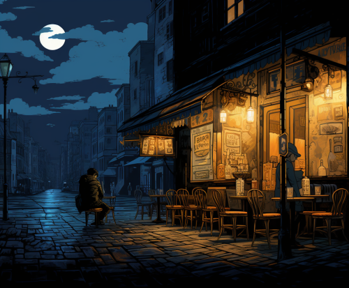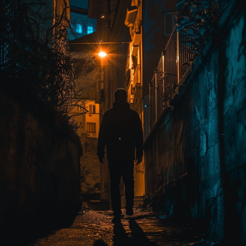 dark man walking on a small street with building, dark, high contrast, street light, 4k