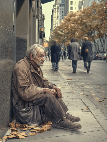 Award winning photo of an elderly man, withered and weary, sitting on a city sidewalk, begging for money as passersby ignore him, highlighting the loneliness and neglect often faced by the elderly. Highly details, Ultra HD, Hyper Realistic image --ar 3:4 --style raw --s 50
