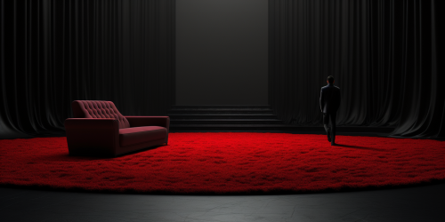 sunray trought the window , a lonely man sitting on a black coach, in a grey living room with red carpet realitistic, shot in 35mm lens --ar 2:1