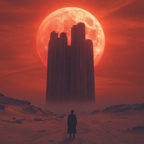 arial view of a very big building alone in middle of desert and man looking at it and look tiny infront of it , desert, oman , mysterious, mars above her head in the sky. red sunset sky. This surreal photography is in the style of Tim Walker, with a kewpie-like shot from a low angle, shallow depth of field, and mysterious cinematic lighting. --v 6.1 --s 750