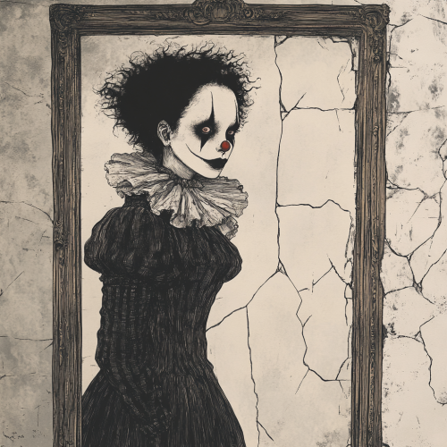 Create an illustration inspired by Edward Gorey’s style. Depict a young woman dressed in an exaggerated clown costume with a ruffled collar and puffed sleeves, standing in front of an old, cracked mirror. Her face is painted with a somber, stylized clown makeup, and she gazes into her reflection with an expression of haunting emptiness. Use meticulous cross-hatching to add depth and shadow to her costume and the cracked mirror frame, enhancing the texture and eerie atmosphere. Keep the character design simple but expressive, with minimal, almost ghostly features and a slightly distorted, elongated silhouette. The background should be sparse, focusing mainly on the mirror and subtle cracks in the wall, adding a symbolic motif that hints at fragility and introspection, characteristic of a melancholic, Gothic ambiance.