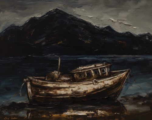 An oil painting in the style of Egon Schiele depicting an isolated small boat with white foam on top of the dark silhouette of a mountain at night, very minimalistic and simple, with only a few details visible and thick brush strokes, the boat is shipwrecked, tilted sideways and sinking --ar 33:26 --v 5.0 --s 750