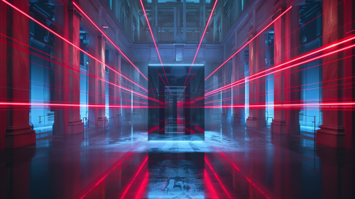 an empty museum at night with a empty glass box surrounded by red laser beams crossing all over the room, high definition, ultra realistic, 4k --v 6.0 --ar 16:9