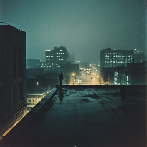 A solitary figure on a city rooftop at night, looking down at the street below, surrounded by a cold mist. The sky is overcast, reflecting city lights dimly. Cinematic style, capturing the isolation of urban loneliness with cool tones. --s 50 --style raw