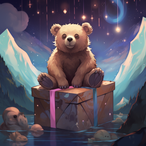 an anthropomorphic bear sitting happily on a large birthday present with deer antlers poking through the top of the box. The bear is looking up at the stars and overlooking a pond in the depths of the abyss. Use the style of anime using pastel colors.