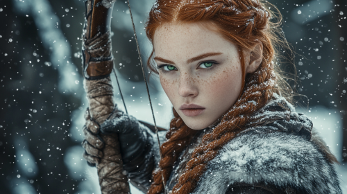 A female archer with long red braids and green eyes, wearing a combination of fur and leather armor, holding a bow, standing on a snow covered glade, snowing weather, fantasy style, dungeons and dragons style, high quality, --ar 16:9 --v 6.1