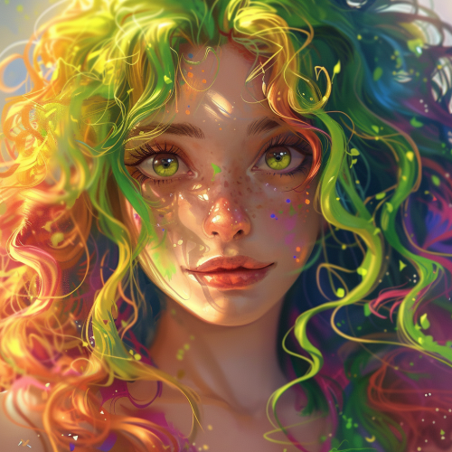 League of Legends art style, reative, free, idealistic, positive, curious, sincere, kind, fairy, young, small, bright, colorful, curly hair --v 6.0