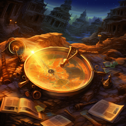 a glowing carto compass, on top of an old map, showing the way to find a treasure, in the style of digital painting, in a lost city full of strange symbols city, tangled nests, robert munsch, mark lovett, subtle lighting contrasts, adventure themed, charming character illustrations, With the zest of a warrior and the poise of an explorer, in the style of epic fantasy scenes, dark gold and azure, kevin hill, storybook illustration, pictorial space, elaborate, 2d game art, the compass pulses with energy in the style of digital painting.
