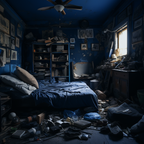 empty dark blue bedroom full of discarded objects which represent lost ideas and hopes