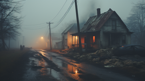 paper cut style, A person standing alone in a vast, foggy landscape, symbolizing a future once filled with ambition now erased, color dark and stormy, The figure filled with a deep sense of despair and powerlessness. Faint traces of what once were vivid, colorful dreams linger in the background, now ghostly and fading, Atmosphere melancholic