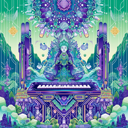 A goddess producing music on a synth in nature, In the style of intricate yet minimalistic psychedelic landscapes, Light cyan and emerald and lavender, Pristine geometric balance, Ethereal symmetry, Cristina mcallister, Detailed character illustrations, Kilian eng, Josan Gonzalez, Taro card, Necronomicon illustrations, Techno shamanism, Reimagined religious art, Made of crystals, Architectonic, Cubo-futurism, hexagons and honeycombs, Mystic mechanisms, illusory wallpaper portraits, Dreamlike illusionism, chalk, Intricate woodcut designs, grid, mind-bending murals, chemical reactions, Woodblock print, Made of all of the above --v 6.0