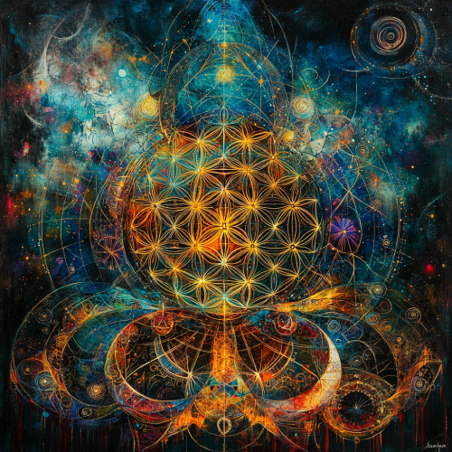 Create a visually stunning representation of complex mathematics intertwined with sacred geometry. Incorporate intricate patterns like the Flower of Life, Fibonacci spiral, and fractals, blending them seamlessly with mathematical symbols and equations. Use a vibrant color palette that highlights the harmony between mathematics and nature, with a mystical background that evokes a sense of wonder and exploration. The composition should feel both structured and organic, inviting viewers to delve into the beauty of mathematical concepts