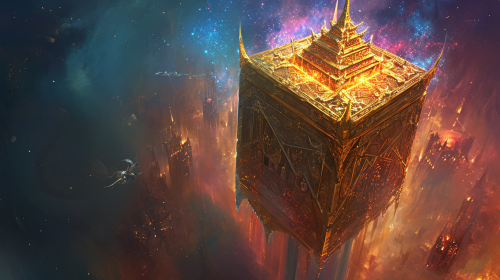 a floating 3D tibetan mandala temple, symmetrically built in six directions in the style of an octohedron, in cosmic space. Waterfalls descending to the middle, tibetan dragon flying around. Temple in ochre, red, blue highlights. Viewing angle slightly above and to the side. Created Using: underlighting, cosmic background, fantasy architecture, dynamic dragon movement, vibrant colors, hd quality, vivid style --ar 16:9 --v 6.0 --chaos 20