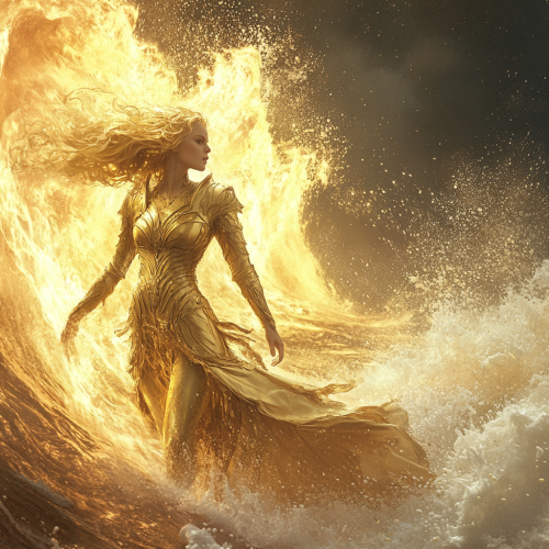 a golden hair woman wearing golden armour walking out on a battlefield with a huge wave racing towards her, she will turn into flames stopping the wave