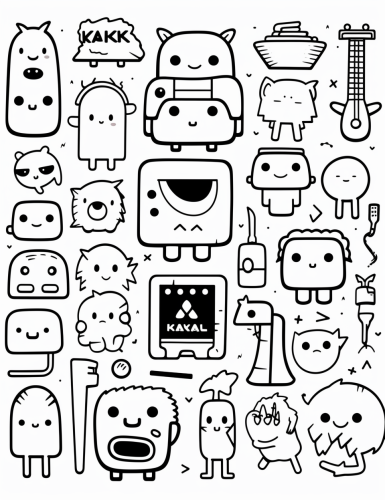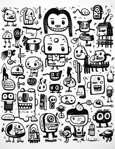 knolling doodles, vector art, stark black and white, stick figure, simple, clean and sharp inking/ --ar 17:22