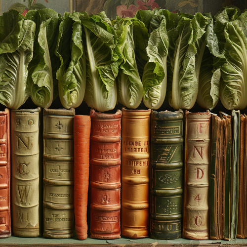 Imagine a grand library where the books' pages are delicate lettuce leaves, each leaf inscribed with thin strips of carrots and cucumbers, creating an edible archive of flavors.