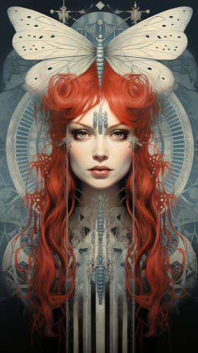 tarot card, portrait, the high priestess with red hair, a blue dragonfly, illustration, black and white, pastel colours --ar 9:16