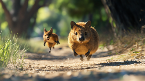 Quokka mother running towards the camera and abandoning her baby behind her. The baby is chased by a fox predator who wants to eat him. Photorealistic, sunny and tropical atmosphere --ar 16:9