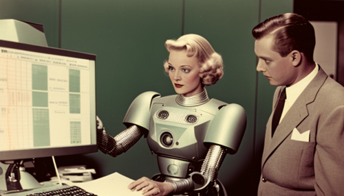 Vintage photograph of an office worker and a 1950s-style robot collaboratively reviewing a large, futuristic clipboard or control panel with dials, knobs, and flashing lights. The robot could hold a pen-like stylus while the human takes notes, creating an image of seamless collaboration. Vintage design elements like pastel colors, metallic finishes, and soft, glowing lights would enhance the scene’s retro-futuristic look. --ar 16:9 --upbeta --v 4
