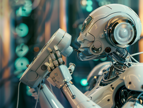 hyperrealistic image of a humanoid robot trying to dial an old-fashioned telephone. The image has a futuristic feel, with colors of silver, white, and greens. --ar 4:3 --v 6.0
