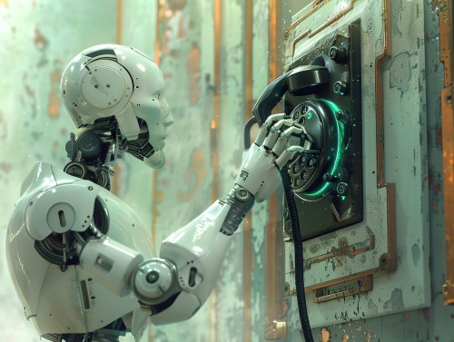 hyperrealistic image of a humanoid robot trying to dial an old-fashioned wall-mounted telephone. The background of the image has a futuristic feel, with colors of silver, white, and green. The telephone is a perfectly preserved relic of the past. --ar 4:3 --v 6.0