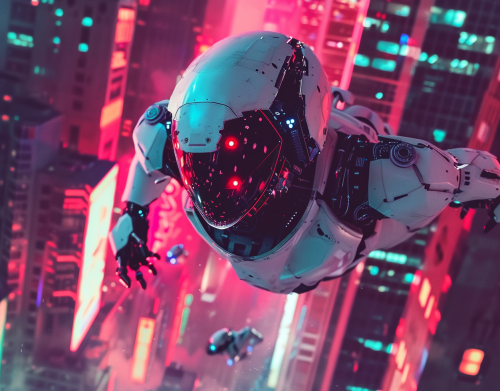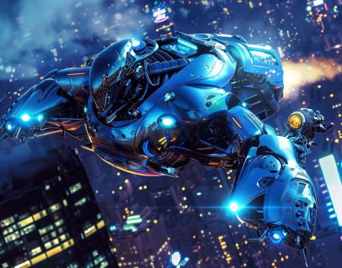 an anime cyberpunk flying robot, sci-fi, vintage, vivid color, nightscape detailed background --v 6.0 --ar 9:7