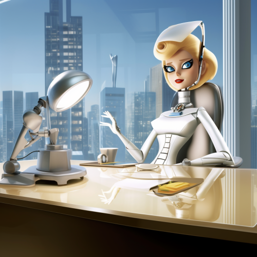 a female robot designed to look like a robot from The Jetsons is in a chair at a desk in a mid-century modern executive's office. The camera is seated in front of the robot looking at her. The lighting is bright daylight. The photo is super-detailed, hyper-realistic, in the style of 1950s stock photography. --no humans