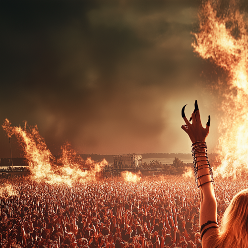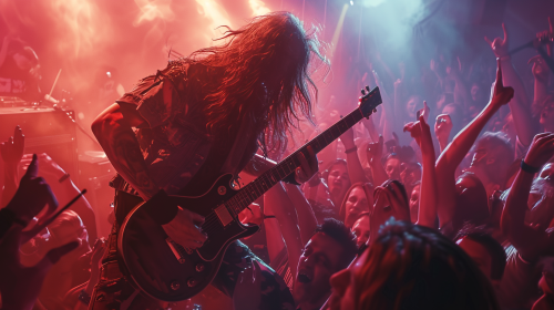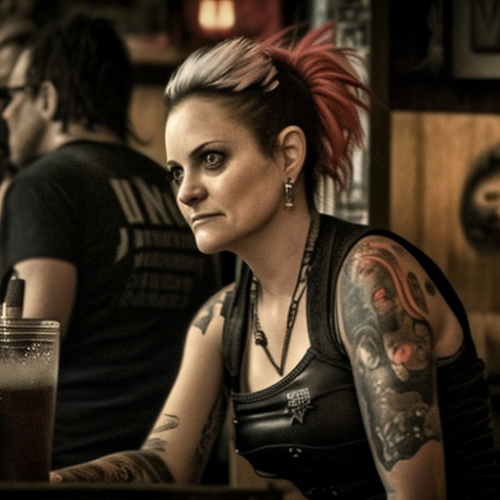 Keara Fallon with sleeveless shirt and black skirt looking like a punk rocker at a bar watching a metal band called Power Falcon in photographic style --upbeta --v 4 --s 750
