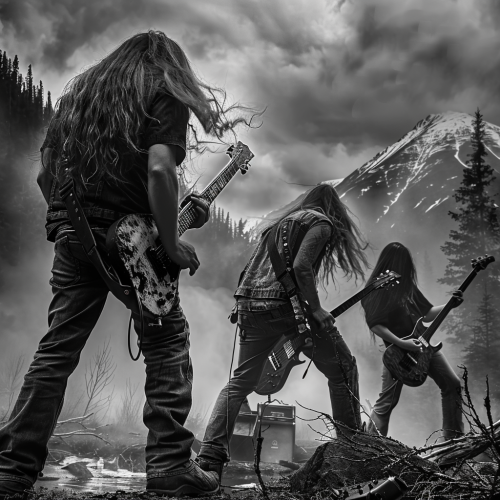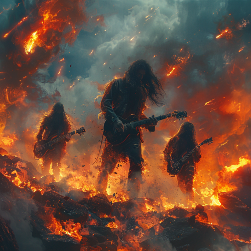 a heavy metal trio, guitarist, bassist and drummer, emerging from the ashes and fires of the wasteland, backlight from thunderbolts and lightings in a storm sky, cinematic, dramatic, photorealistic, intricate details, real textures, volumetric realistic light, album cover, high resolution, highly detailed --ar 1:1 --v 6.0 --s 750