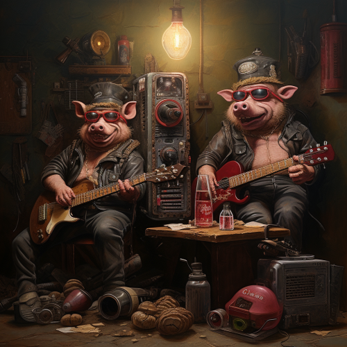 2 bad and giggling cyberpunk pigs holding an electric guitar, in a room with several big salamis and sausages "soppressa vicentina" style hanged on the wall, red wine rustic and peasant bottles and glasses on the table, but it's an 80s heavy metal album cover. 80s style pianted and realistic