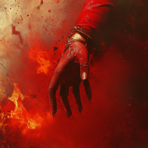 Red Female hand signalling the Karana Mudrā breaking through the ground with fire and flames, album cover, 4k, high definition, album art, heavy metal --chaos 10 --v 6.1