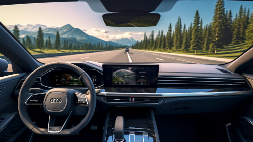 luxury, fast car, nice display, head-up display with assistent, driving on road, realistic, natural lighting, --ar 16:9 --style raw