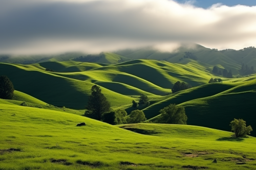 Lush green forest in a bright mist, uplifting and serene atmosphere. Vibrant, healthy trees, clear pathways, fresh air. More clarity. Technique: Semi-realistic, --aspect 7:4