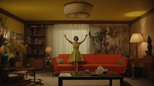 portrait style happy painting of California set in 1960 American style for living room corridor with burnt orange, olive green, yellow and beige colour shades