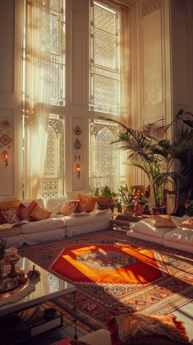 Lifestyle Photography, luxurious 1960s living room scene in Las Vegas NV in moroccan decor style, Wide Angle, Deep Focus, Natural Sunlight, Film Photography, Photorealistic --ar 9:16