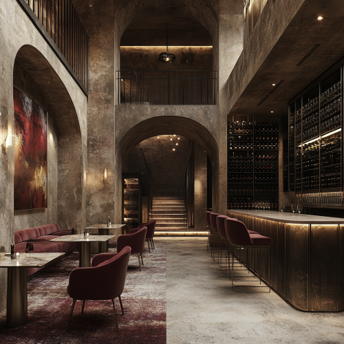 the interior design concept for a high end art gallery that is also a wine bar. It is called the Gallery of Wine, and shows contemporary art, while also showcasing high end wines. The design is modern Parisian, with accents of deep wine and burgundy tones. There are tables for guests to sit at and a bar for serving. --s 250