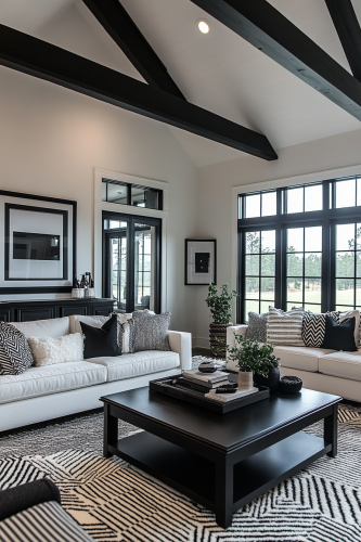 a hyper realistic photograph of a luxury high end minimalistic styled living room, B&B Italia, bright, minimal pop of deep color, kelly wearstler inspired, large minimal art work with small pops of deep muted color, white walls, elegant black trim such as crown molding, canon eos r3, 50mm, hyperrealistic, photorealism, intricate details, cinematic, megapixel cinematic lighting, anti-aliasing, SFX, VFX, CGI, RTX, SSAO, FKAA, TXAA, HDR, 8k --s 50