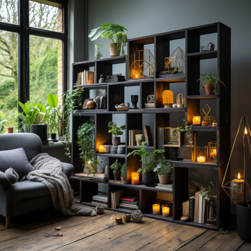 A large bookcase made of black iron, the whole skeleton is black and inside it is combined with random light wooden square units inside the iron, shelves for books, candlesticks, the shelves of different sizes and heights\ --style raw --s 750