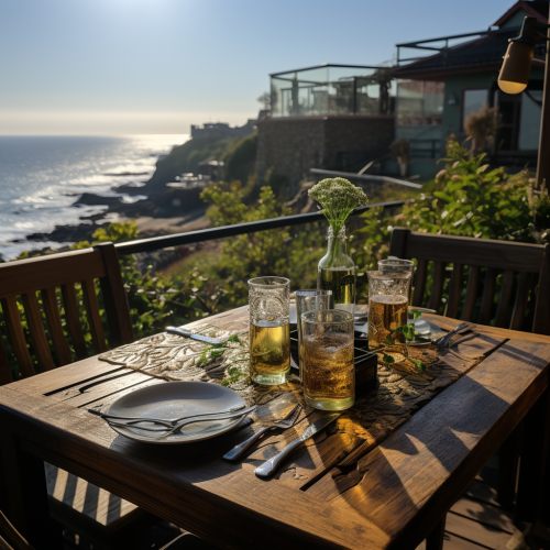 view on a small garden on a cliff with view over the ocean. on a black table it is prepared for dinner with water glasses and a black thermo bottle. there are no flowers on the table. --style raw --s 750
