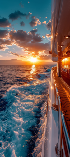 realistic photo inside of a luxury yacht looking out over the shimmering ocean with the california coastline in the distance on a beautiful sunny day with golden sunlight at 24mm, 50 megapixels, DPI 300, --ar 9:20 --s 750 --v 6.0 --style raw